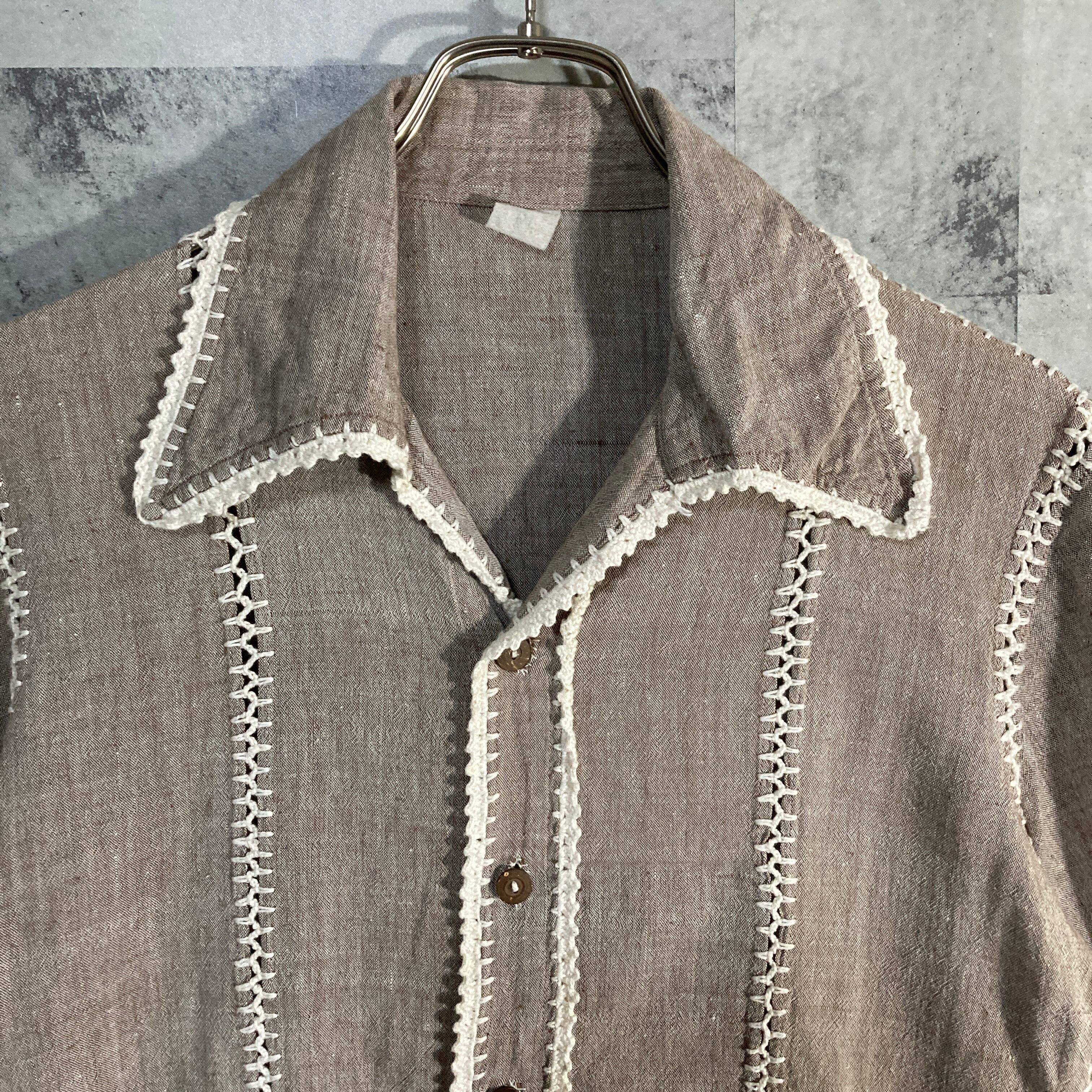 60's-70's クロシェ鍵網み切り替えパネルシャツ コットン ブラウン S