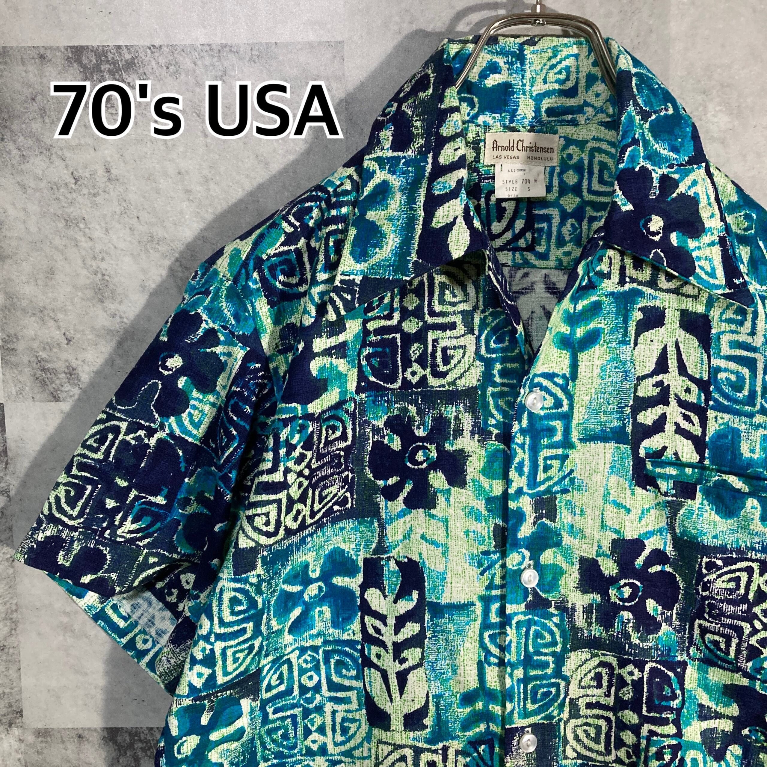 70s USA製 Arnord Christemsen ハワイアンシャツ オープンカラー ブルー S