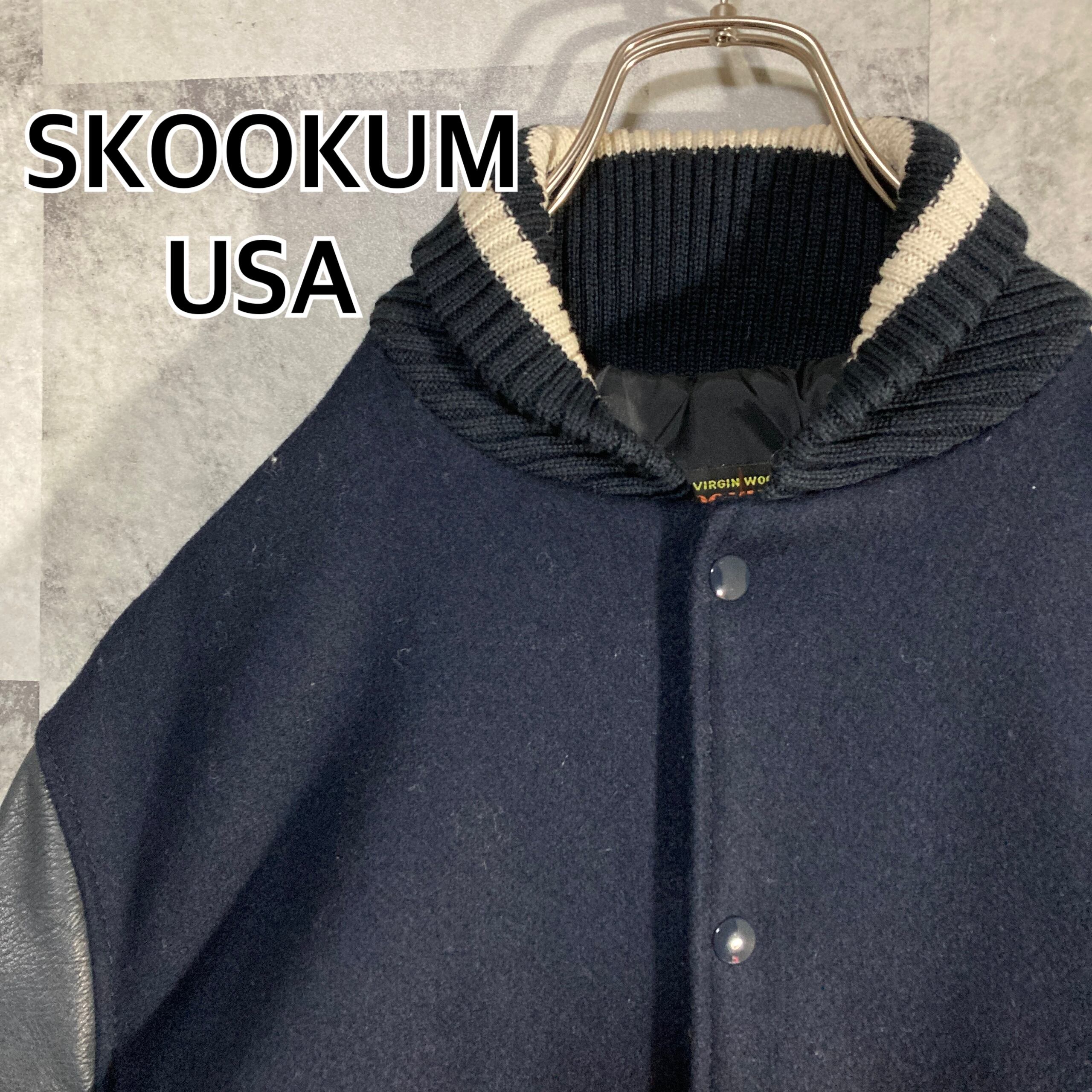 USA製SKOOKUMのアワードジャケット、メルトンウールのボディと袖レザーが雰囲気抜群です。