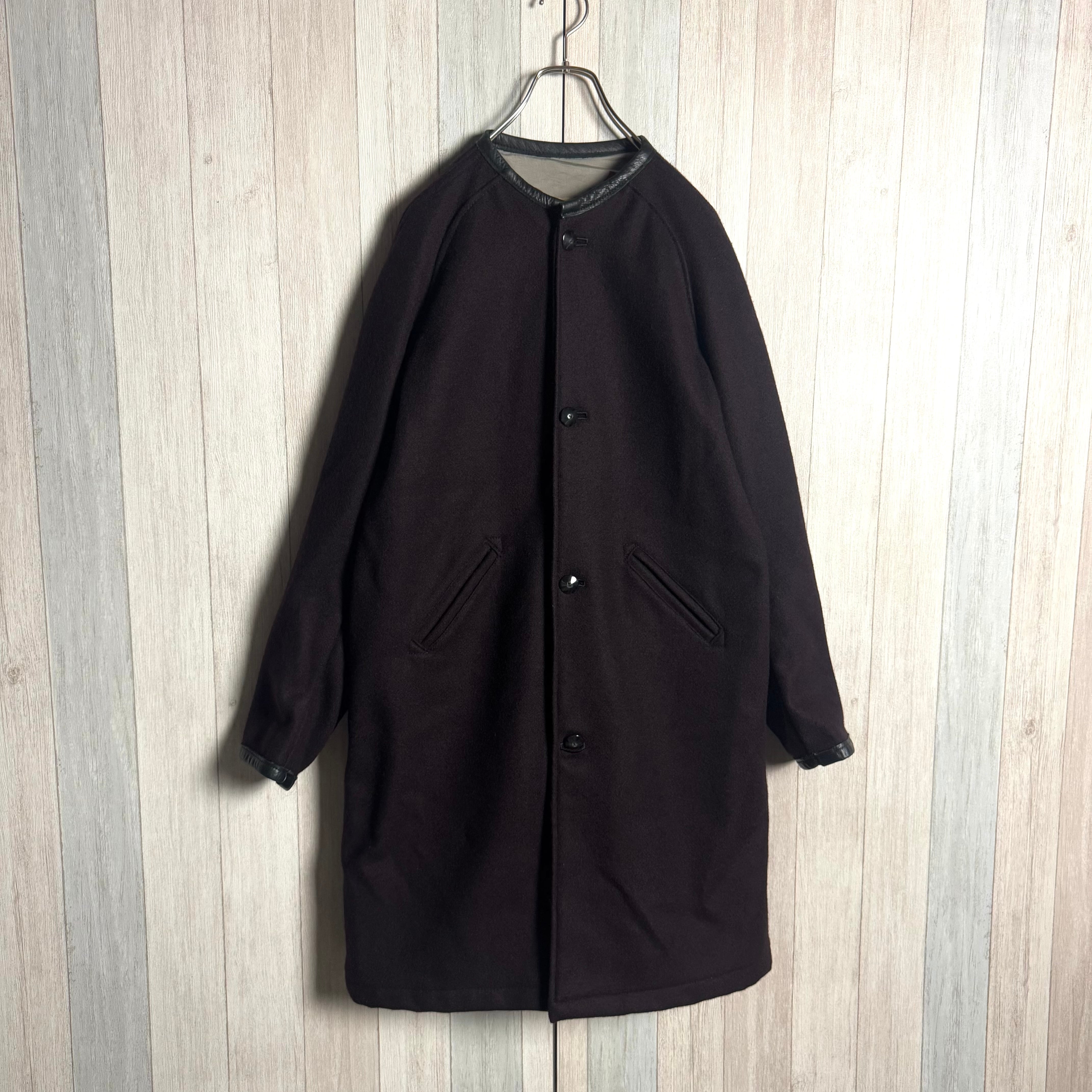 洗練されたスタイルが魅力のこのノーカラーコートは、クールな印象を与えつつ、心地良い温かさを提供します。バーガンディの深みのある色合いは、さまざまなスタイルにマッチし、シーズンを通じて活躍するアイテムです。