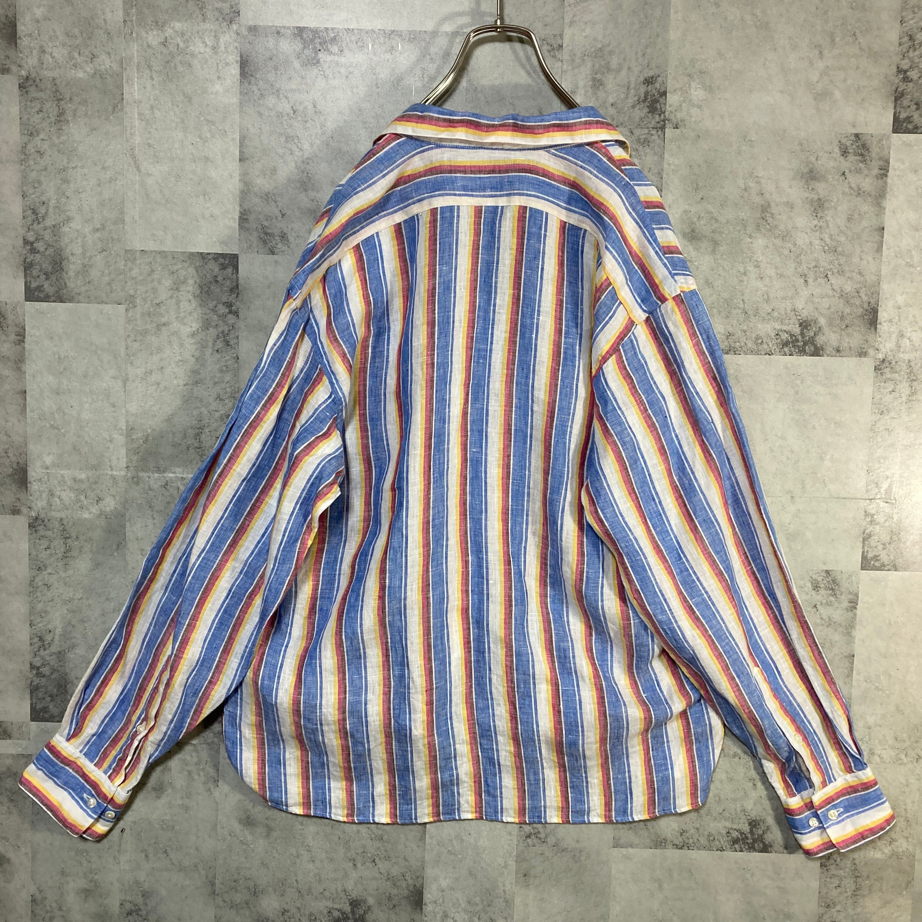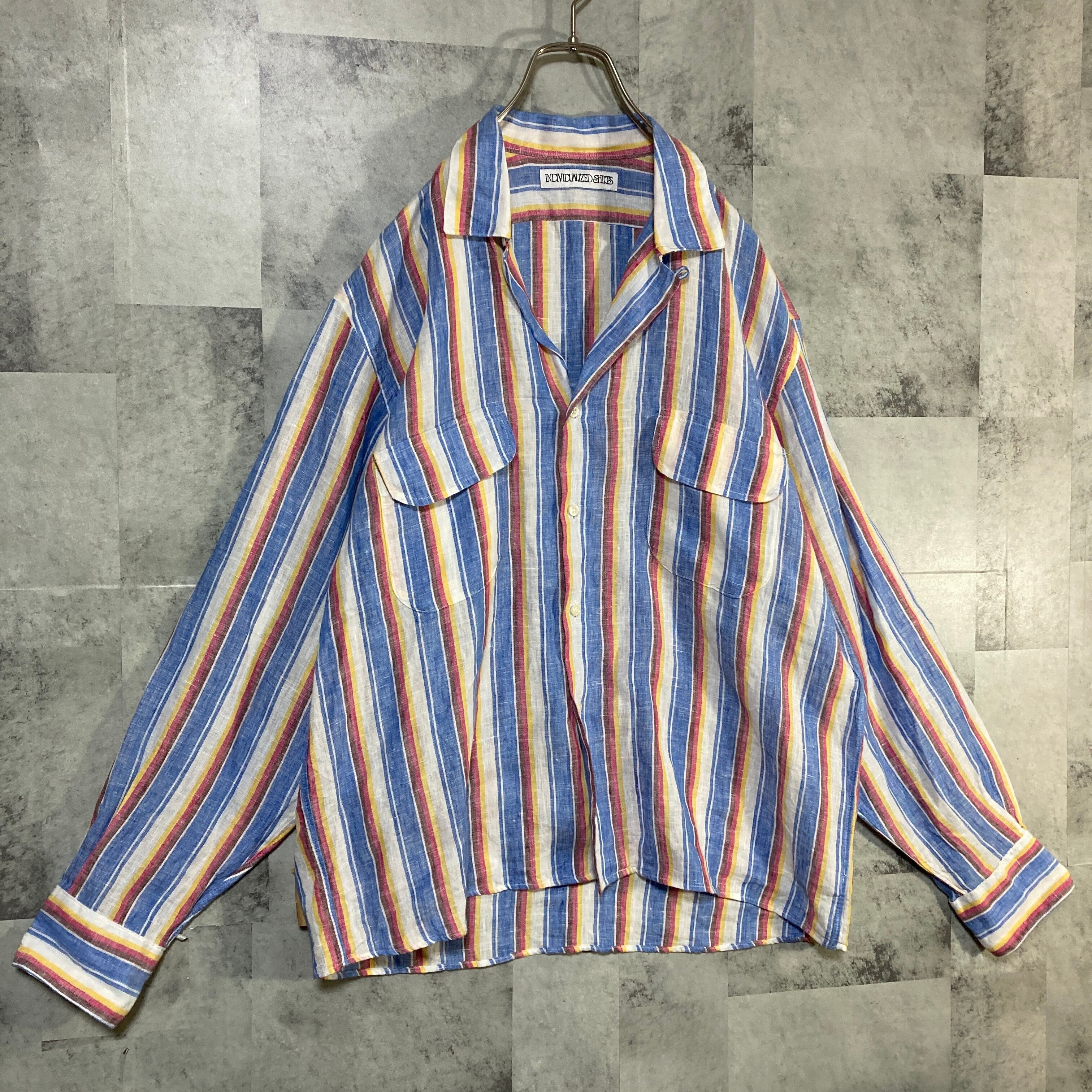 USA製 INDIVIDUALIZED SHIRTS インディヴィジュアライズド シャツ 長袖 オープンカラーシャツ リネン ストライプ L