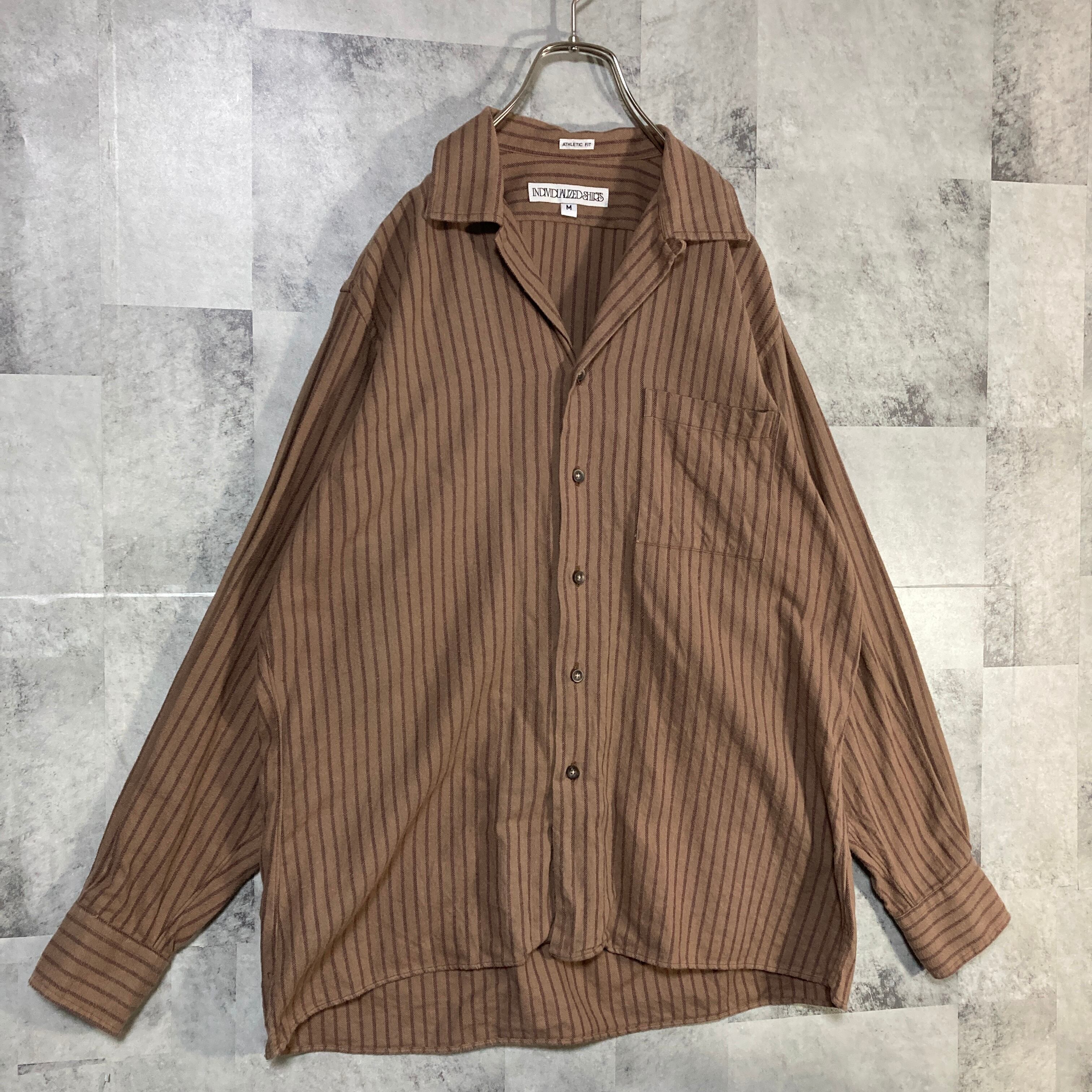 USA製 INDIVIDUALIZED SHIRTS インディヴィジュアライズド シャツ 長袖 オープンカラーシャツ コットンフランネル ストライプ ブラウン M