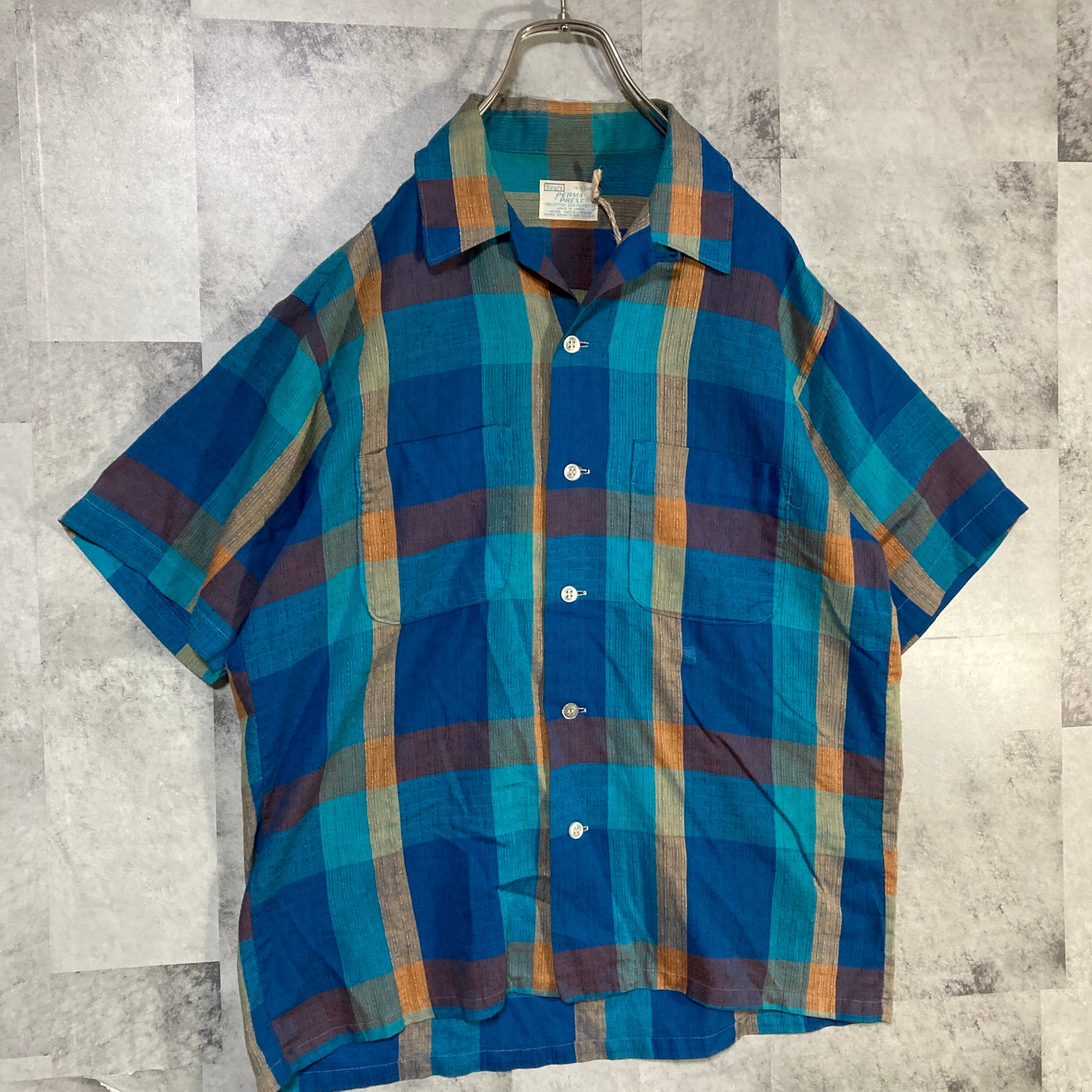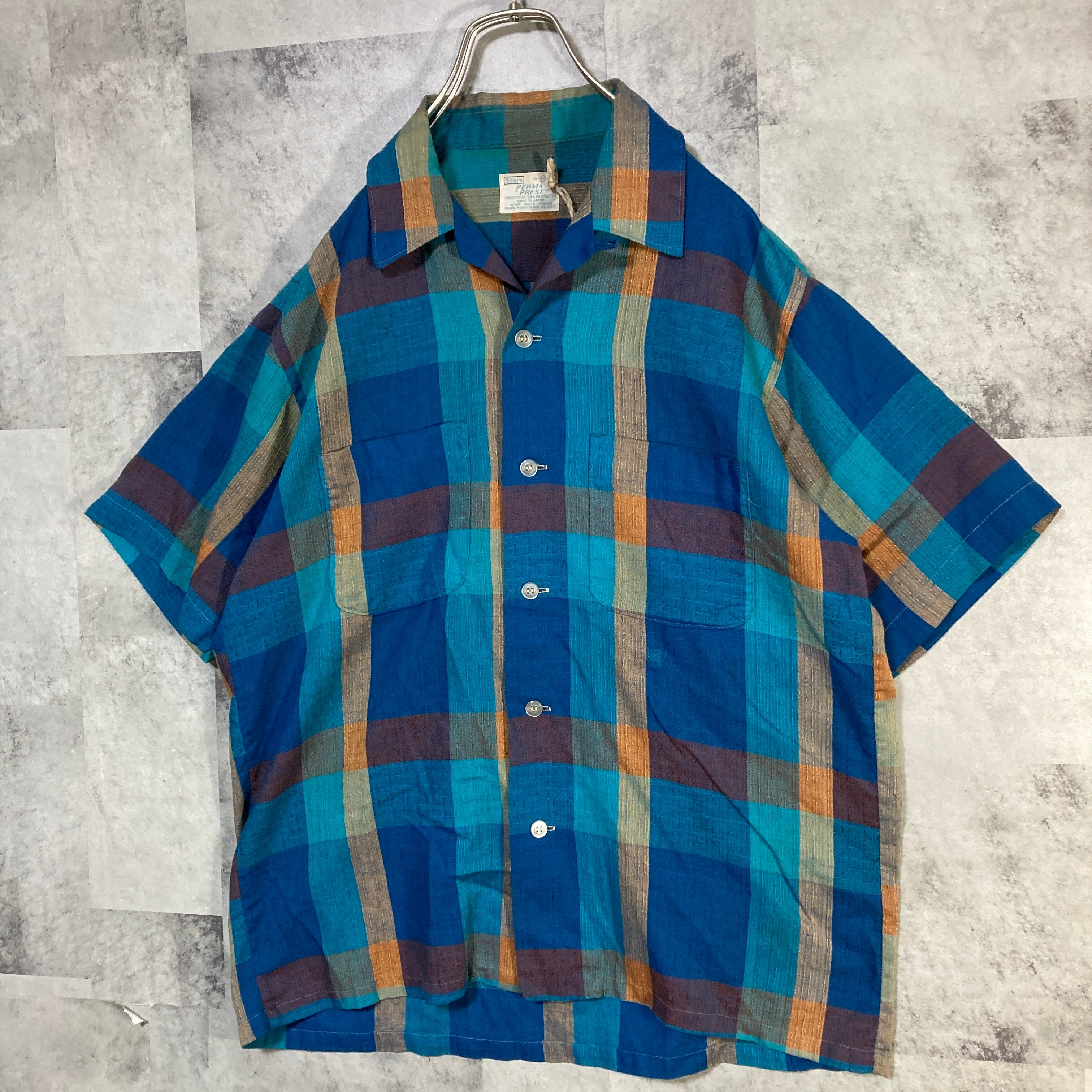 日本製 70’s Sears シアーズ 半袖 オープンカラーシャツ カスリチェック ブルー M ヴィンテージ